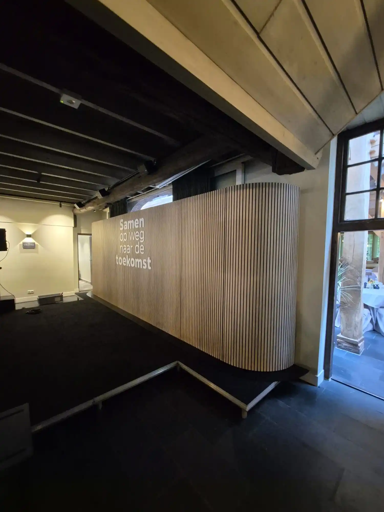 Naast functionaliteit speelde ook de uitstraling een belangrijke rol. De Flexpanel-wanden zijn neutraal afgewerkt, waardoor ze eenvoudig voorzien konden worden van de gewenste belettering en visuele branding. Voor deze roadshow werden de panelen beplakt met logo’s, slogans en visuals van de organisatie, waardoor de ruimtes niet alleen functioneel, maar ook volledig on-brand waren. Dit versterkte de professionele uitstraling en maakte de roadshow herkenbaar en memorabel voor bezoekers.